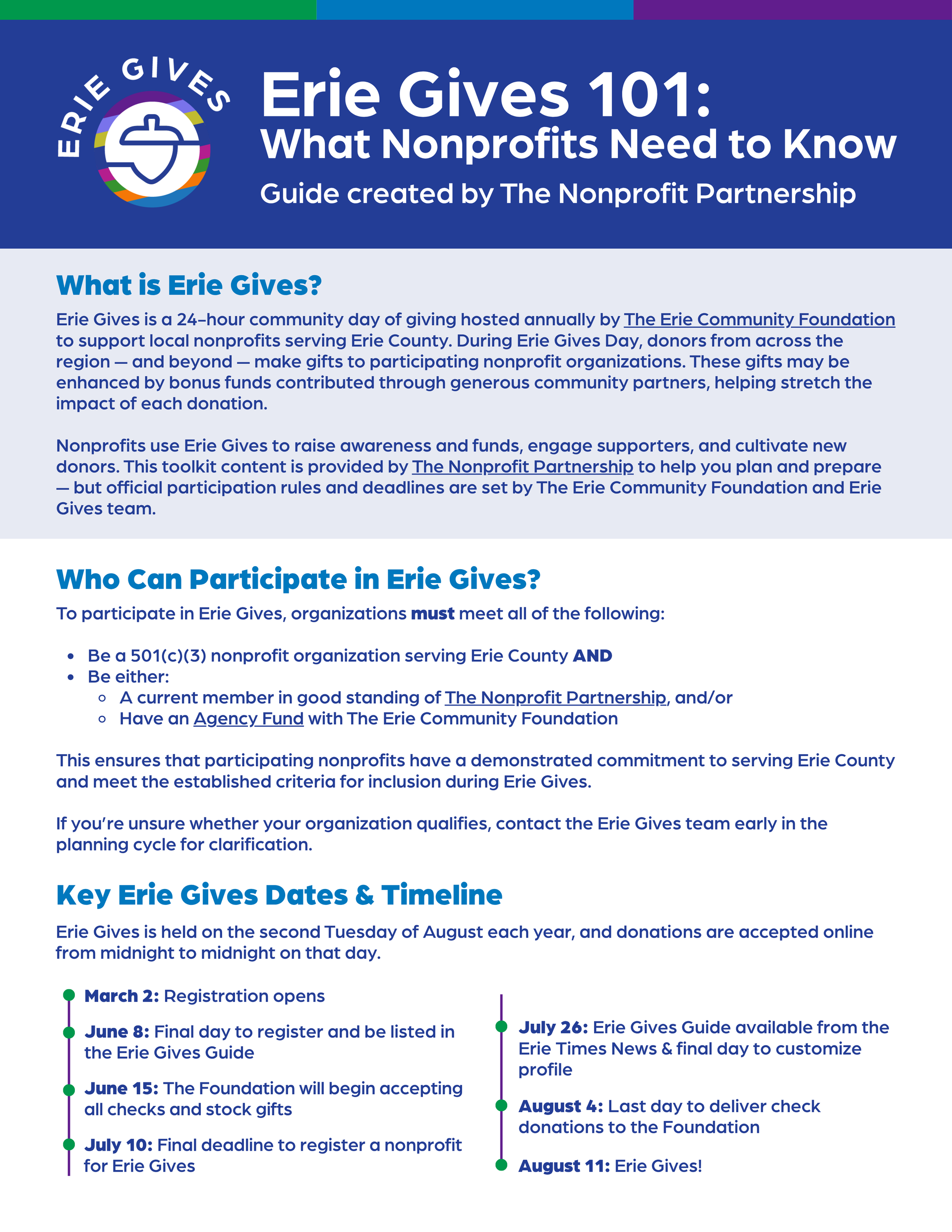 Stay on track with key dates, deadlines, and campaign milestones leading up to Erie Gives.