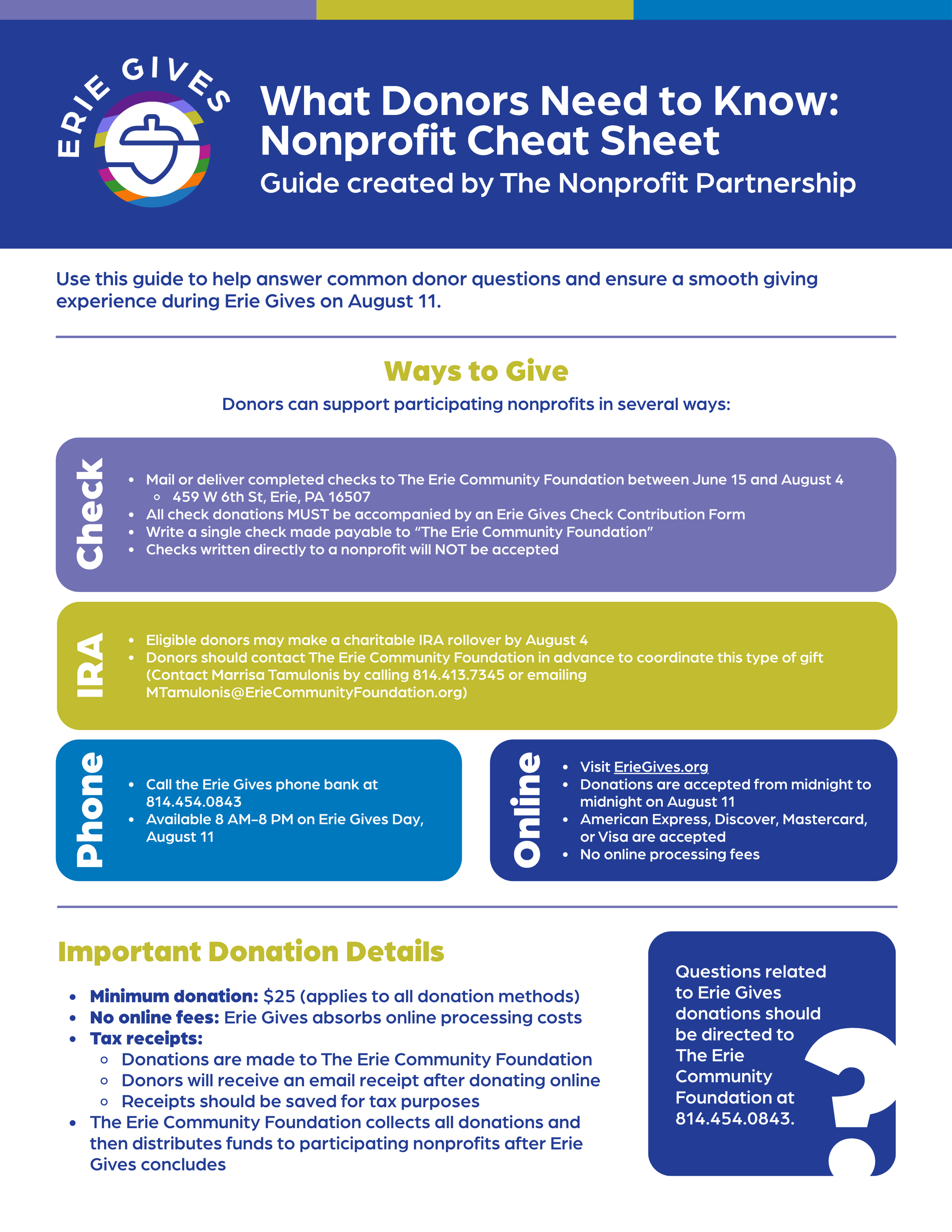 ✅ Drop off a check at the Erie Community Foundation by 8 PM. Checks must be accompanied by a Check Donation Form and made out to The Erie Community Foundation (checks made out to any other organization will NOT be accepted).