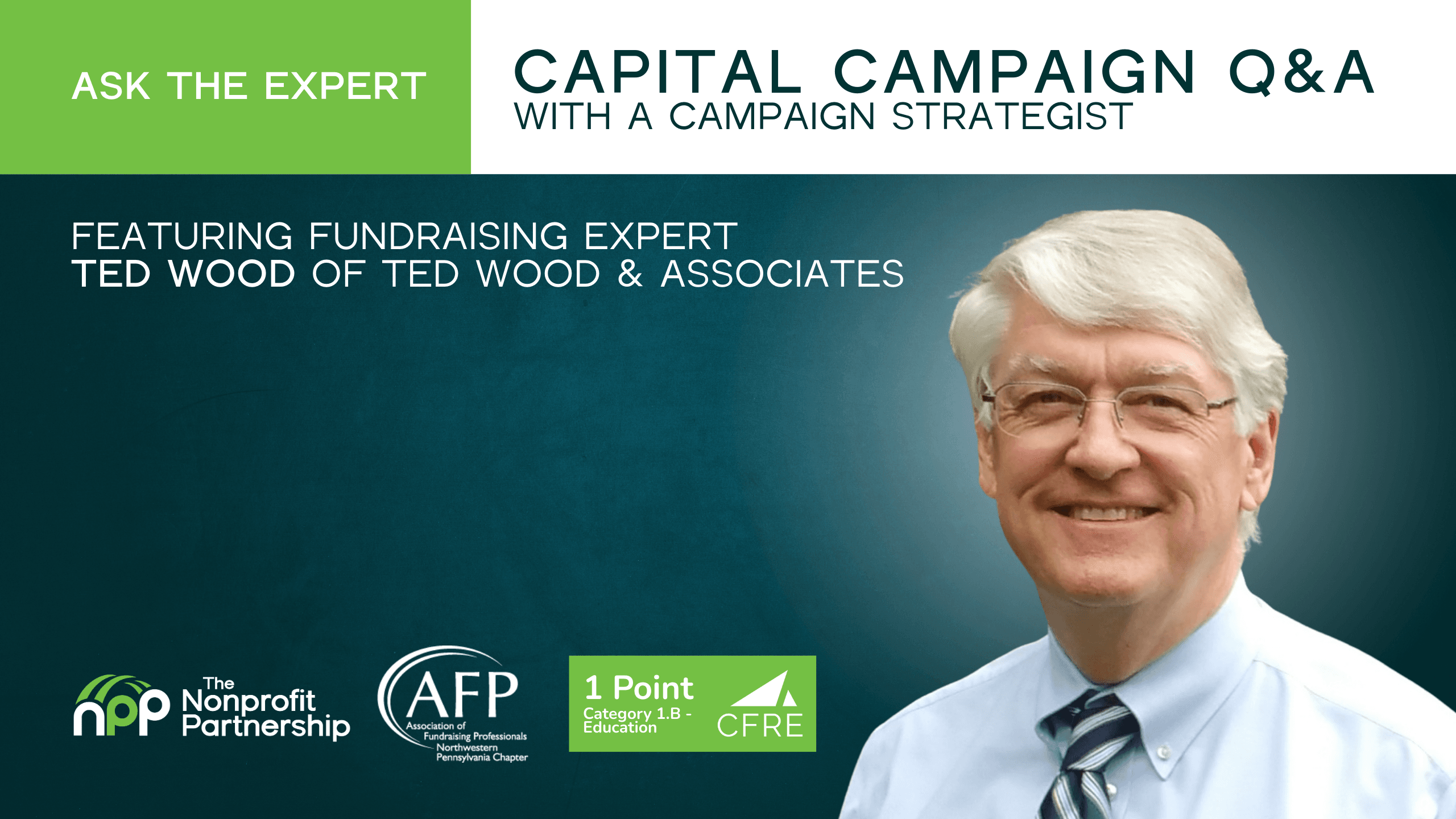 CFRE Eligible: Full participation in "Ask the Expert: Capital Campaign Q&A with a Campaign Strategist" is applicable for 1 points in Category 1.B -Education of the CFRE International application for initial certification and/or recertification. Please contact Emmy Geiger at EGeiger@YourNPP.org for details.