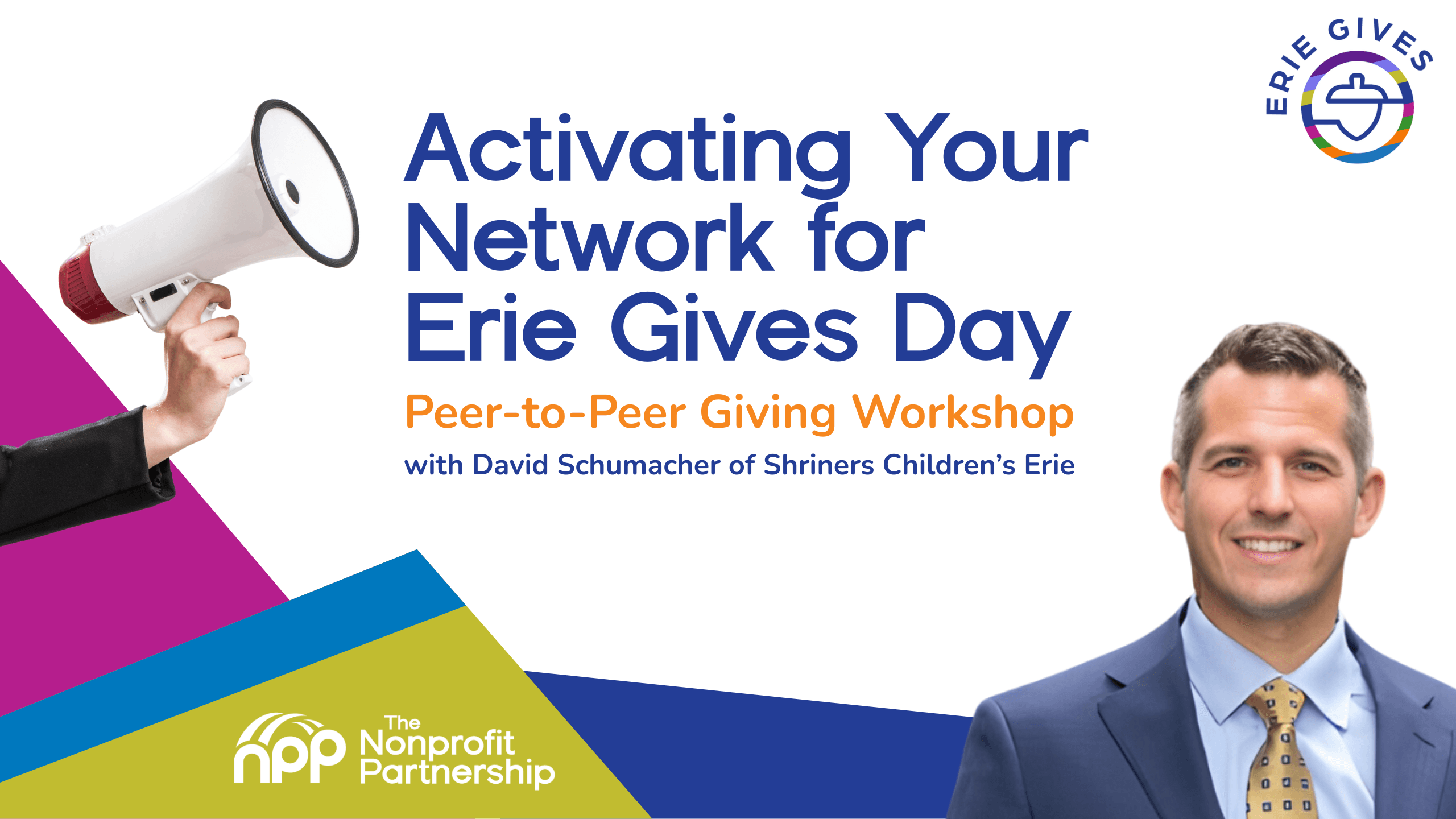 This interactive workshop explores how peer-to-peer fundraising can expand your reach and strengthen your Erie Gives Day campaign. Led by seasoned Erie Gives Day practitioner, David Schumacher of Shriners Children's Erie, this session will cover practical ways to engage board members, volunteers, and committed supporters as fundraisers and storytellers.