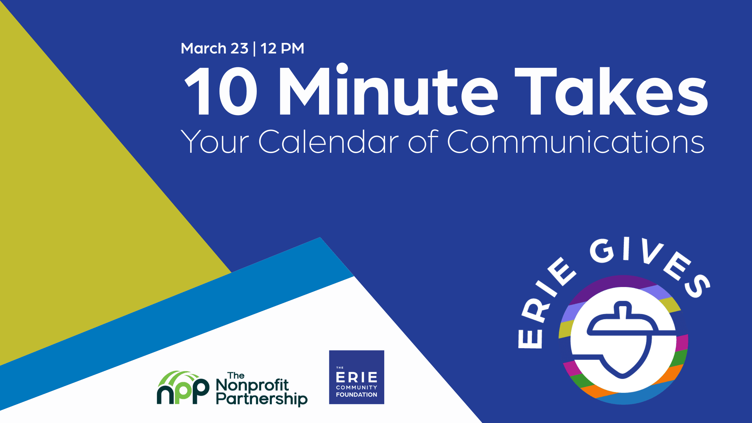 Please join The Nonprofit Partnership and The Erie Community Foundation for 10-Minute Takes: a series of virtual meeting opportunities to keep you focused on making Erie Gives 2026 the best it can be for your nonprofit.
